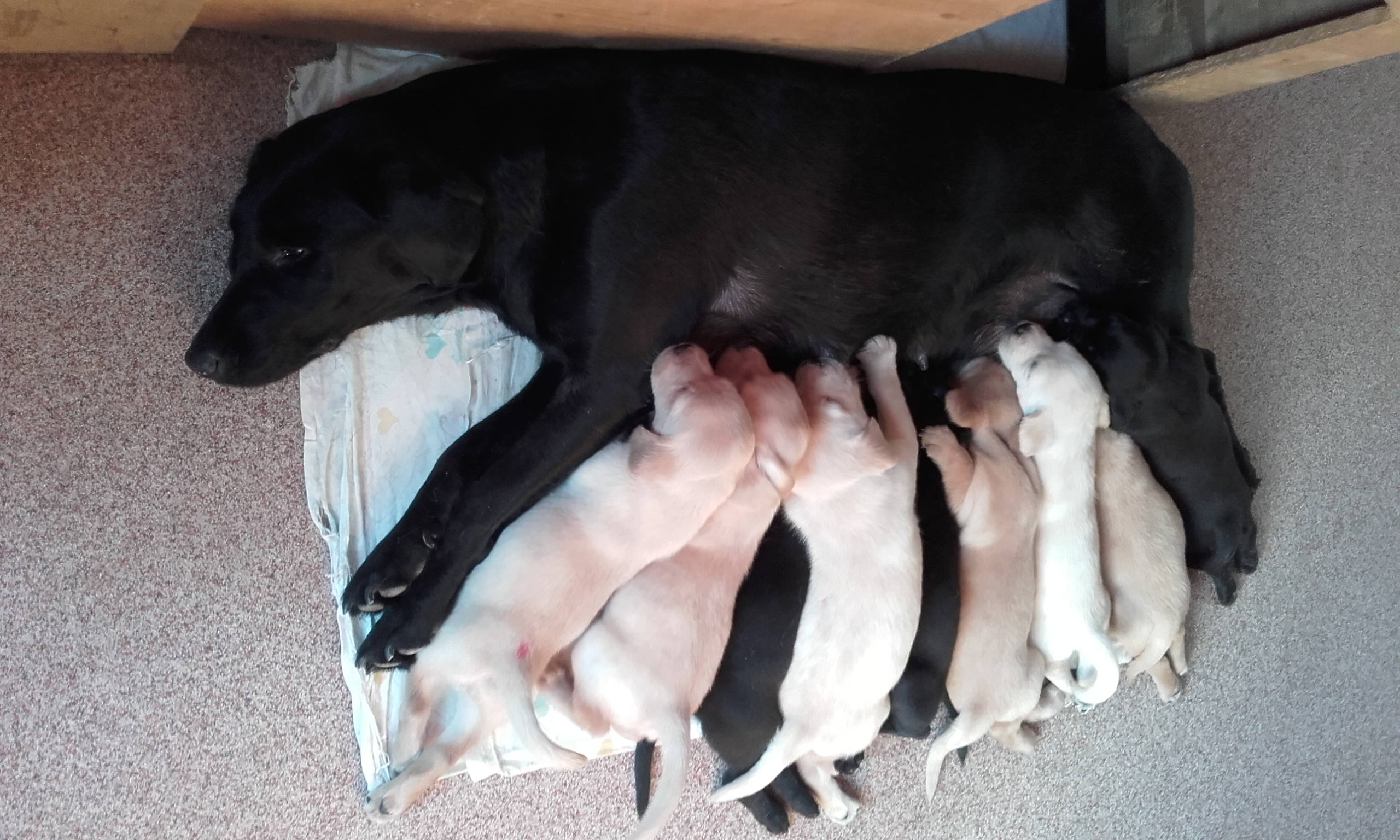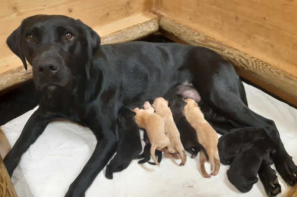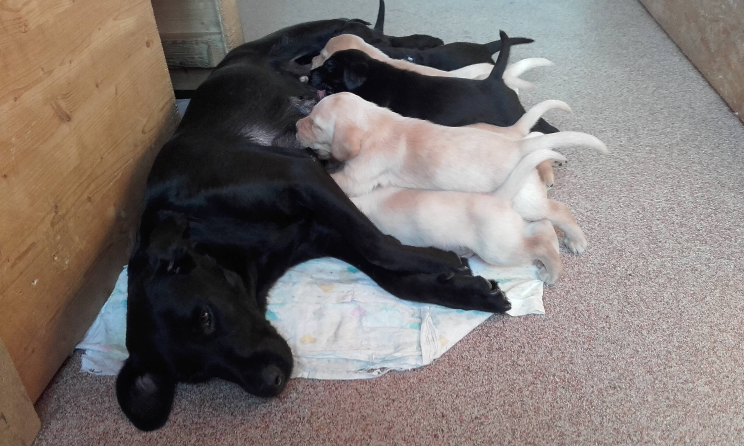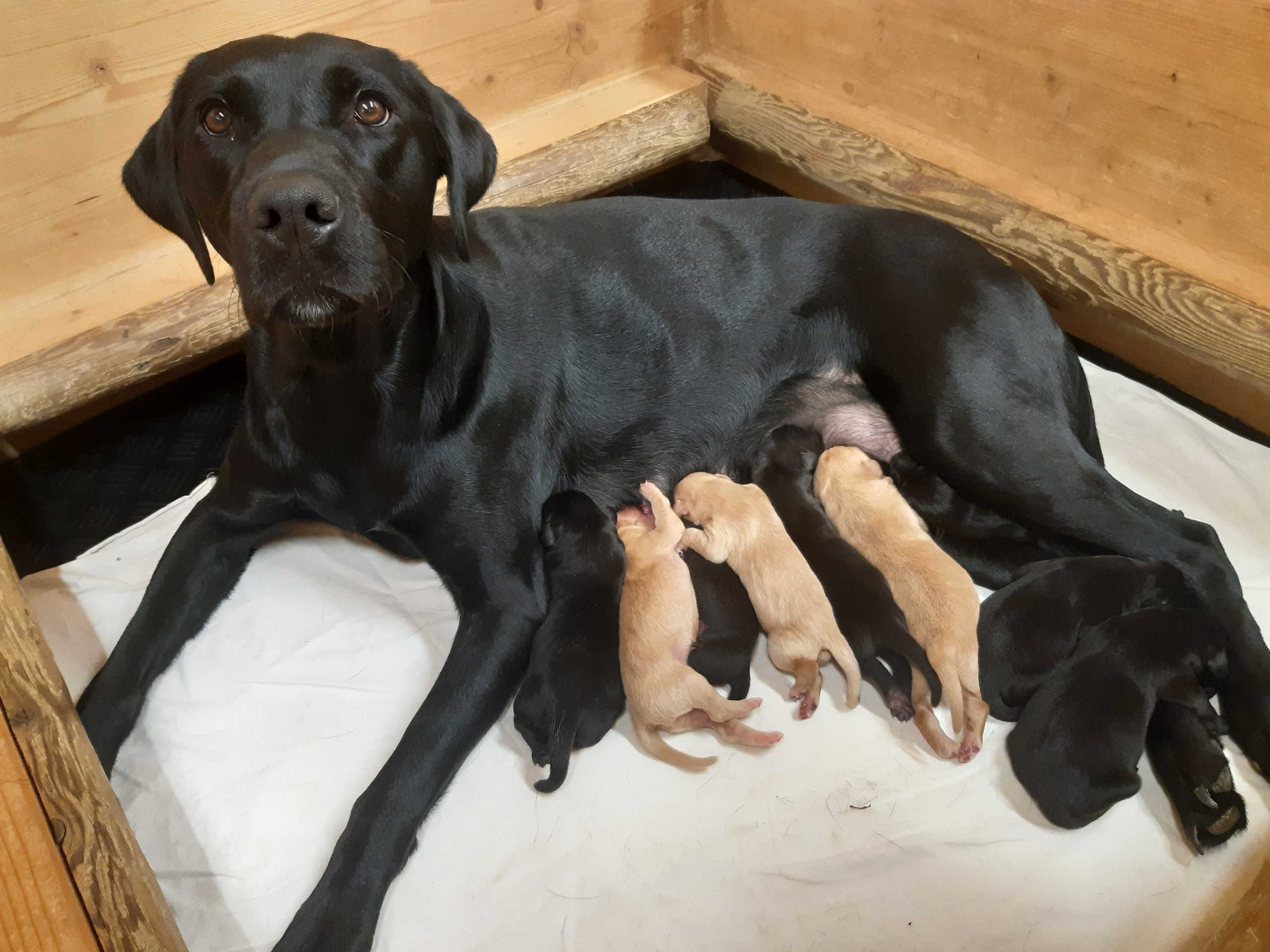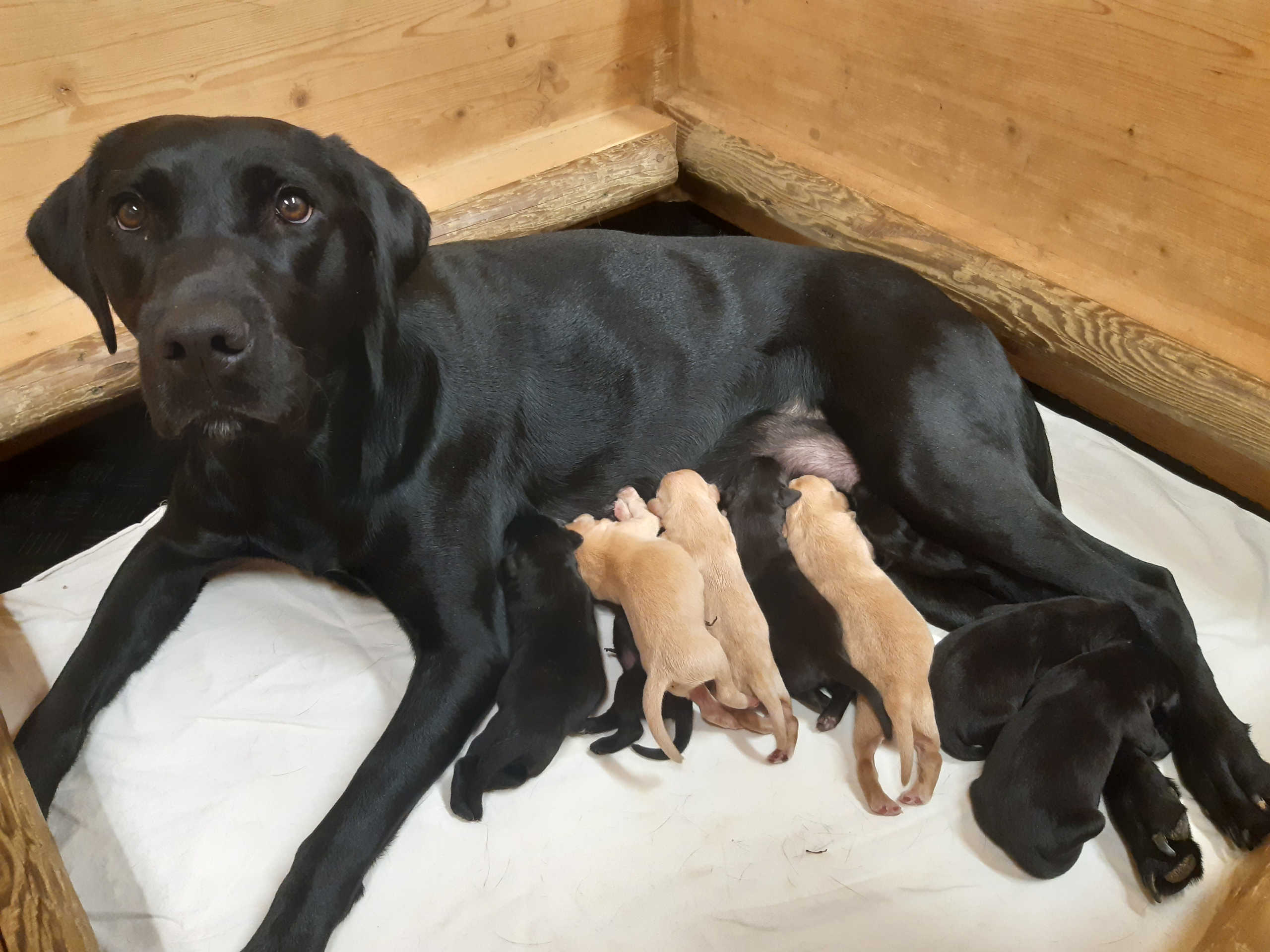 Unsere Ota hat am 2. Februar 2026 neun Welpen zur Welt gebracht, drei schwarze Rüden, drei gelbe Rüden, drei schwarze Hündinnen. Leider sind zwei Welpen verstorben. Die übrigen sieben Welpen entwickeln sich prächtig. Wir freuen uns jeden Tag über ihre lebhafte Entwicklung. Ota ist eine liebevolle Hundemama. Fotos vom P-Wurf in der Fotogalerie
